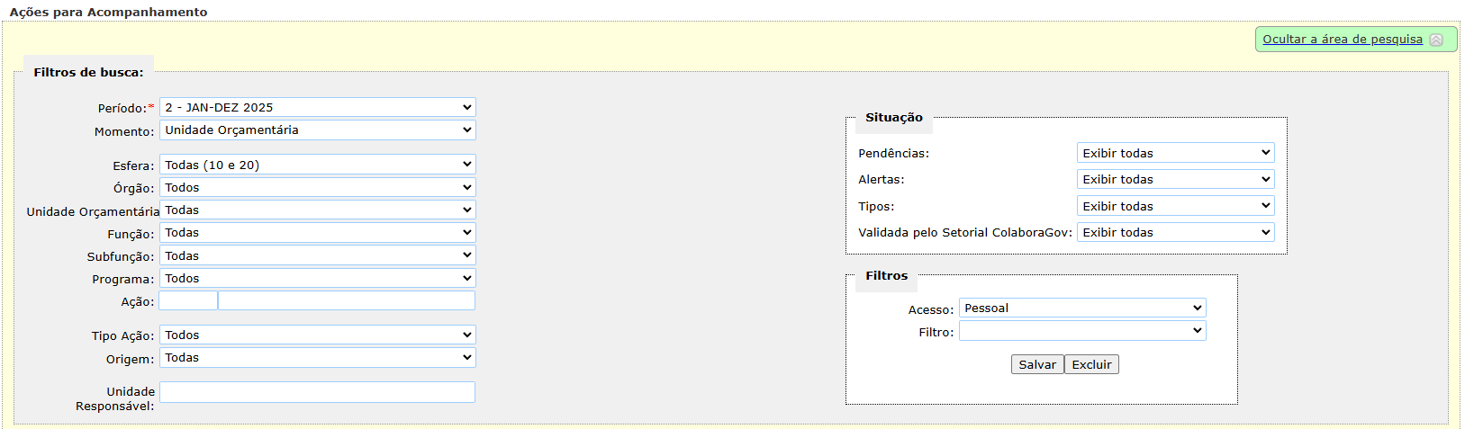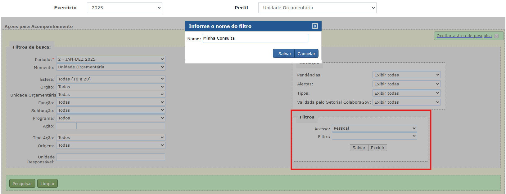 Depois de informar os parâmetros, o usuário poderá salvá-los para uso futuro. Para isso, deve-se escolher entre o acesso pessoal (apenas o próprio usuário poderá usar o filtro) ou geral (todos os usuários do SIOP poderão usar o filtro), clicar no botão Salvar e digitar um nome. Pode ser excluída alguma consulta criada após a seleção dela, clicando no botão Excluir.