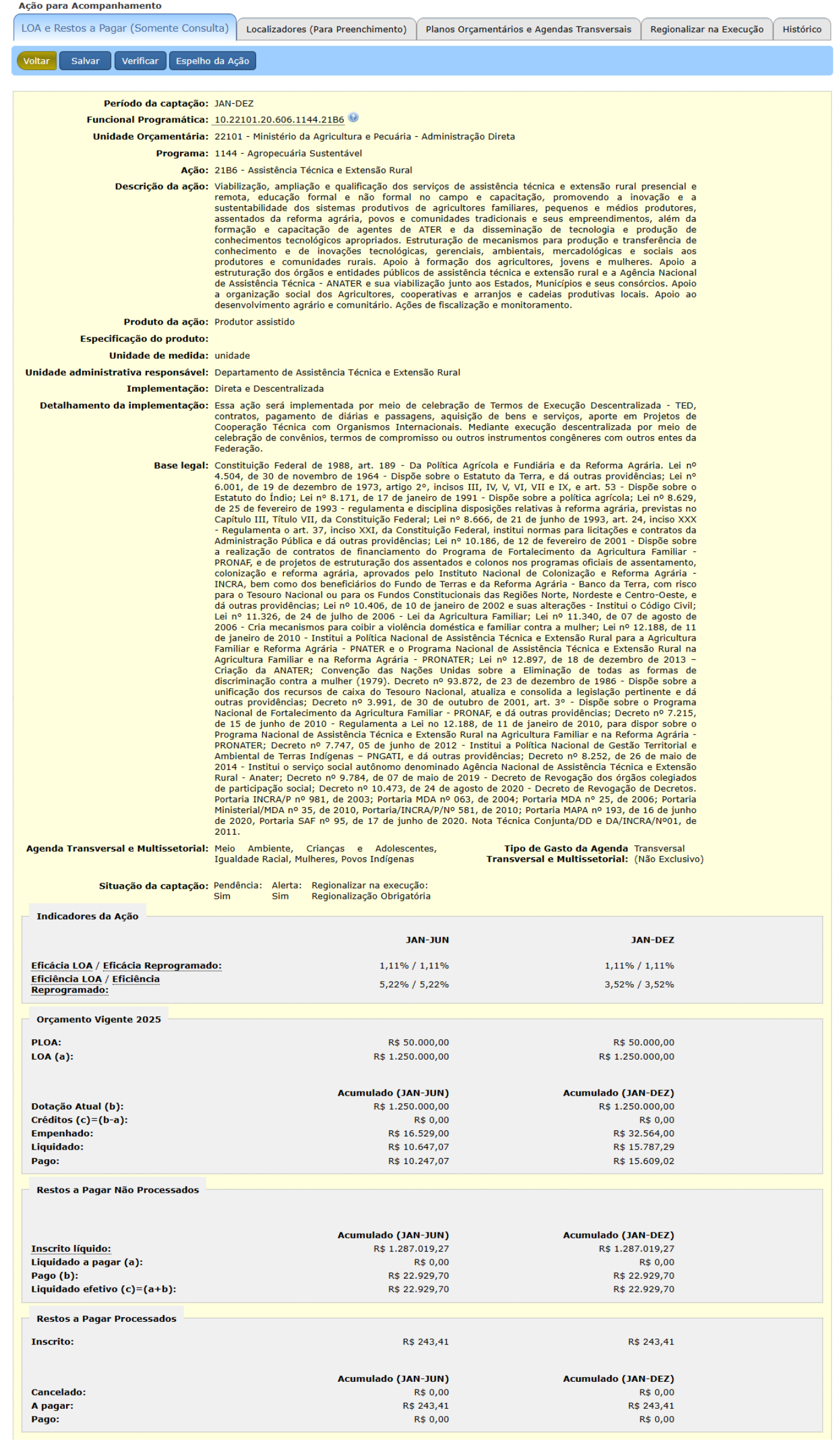 A aba “LOA e Restos a Pagar (Somente Consulta)” apresenta as informações qualitativas da Ação e os dados financeiros relativos aos períodos de captação, entre os quais estão: