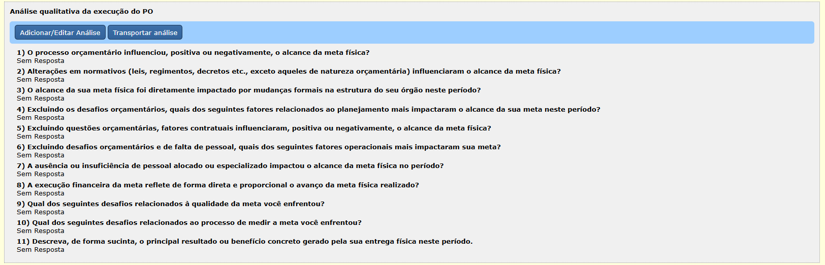 Para preencher o questionário de análise do PO, requerido somente na captação final do exercício, o usuário deverá clicar no botão “Adicionar/Editar Análise”, selecionar as respostas e salvar. A análise salva pode ser transportada para o localizador ou para outros planos orçamentários.
