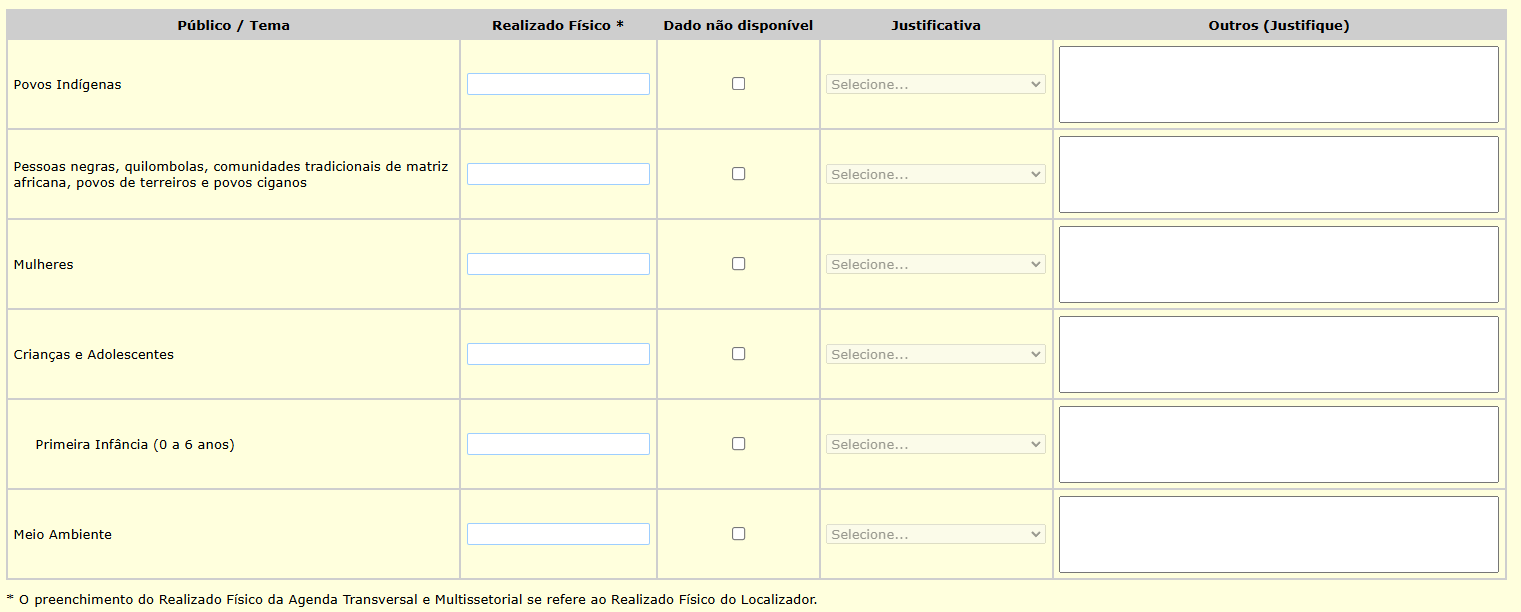Nesta seção, o usuário deve indicar a execução física realizada (Realizado Físico) para cada público ou tema da Agenda Transversal e Multissetorial.