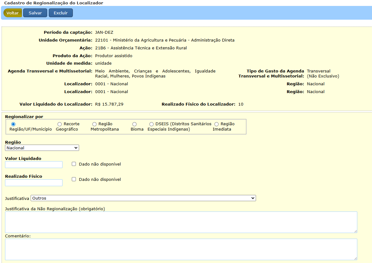 Se o usuário escolher a região “Nacional”, é obrigatório preencher o campo “Justificativa”. Este campo é apresentado em uma lista que contém 7 opções de escolha, quais sejam: “O projeto ou política pública tem impacto ou atuação em todo o território nacional”, “A característica da despesa impede a regionalização”, “A ausência de sistemas adequados, dados suficientes ou metodologias definidas impede a regionalização”, “Folha de pagamento, aposentadorias, pensões e benefícios são administrados de forma centralizada”, “Não houve execução física ou financeira” e a opção “Outros”