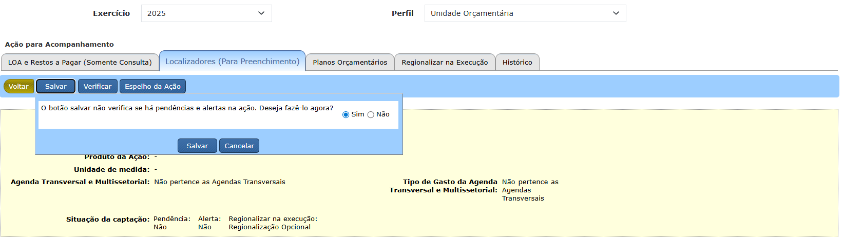 a. Ao clicar no botão “Salvar”, é apresentada uma janela questionando se o usuário deseja verificar ou apenas salvar as informações referentes à ação.