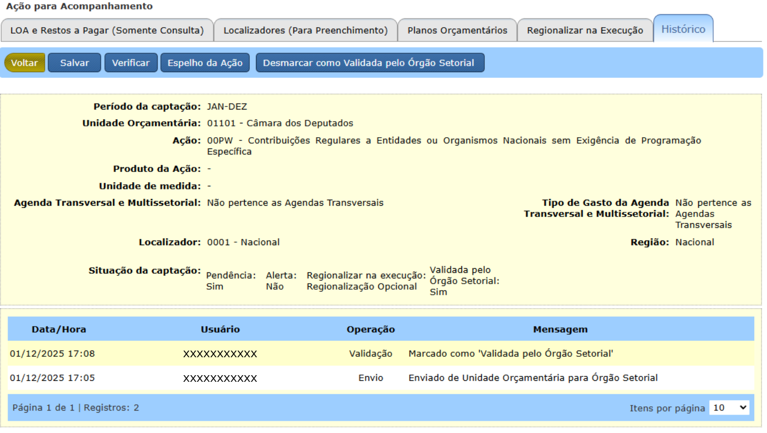 Essa validação visa a auxiliar no controle de quais ações recebidas das UOs já foram analisadas pelo Órgão Setorial. Trata-se, portanto, de uma fase de “homologação” das ações pelo Órgão Setorial, de forma que eles possam marcar aquelas já analisadas, até que seja habilitado o envio para Formalização.