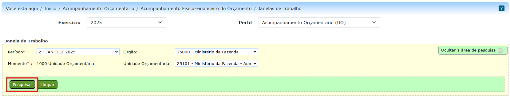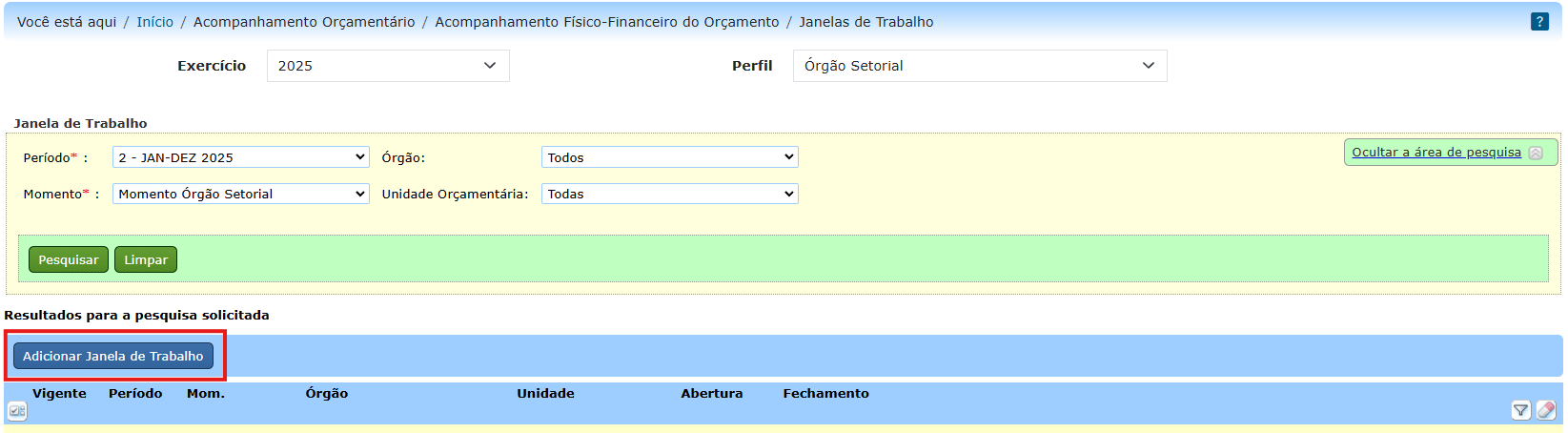 Ao acessar o item de menu Janelas de Trabalho, é exibida a tela de pesquisa abaixo. Selecione/preencha os campos: Período (obrigatório), Momento (obrigatório), Órgão (opcional) e Unidade Orçamentária (opcional), e clique no botão “Pesquisar”: