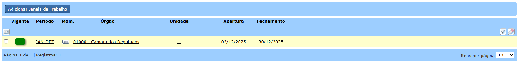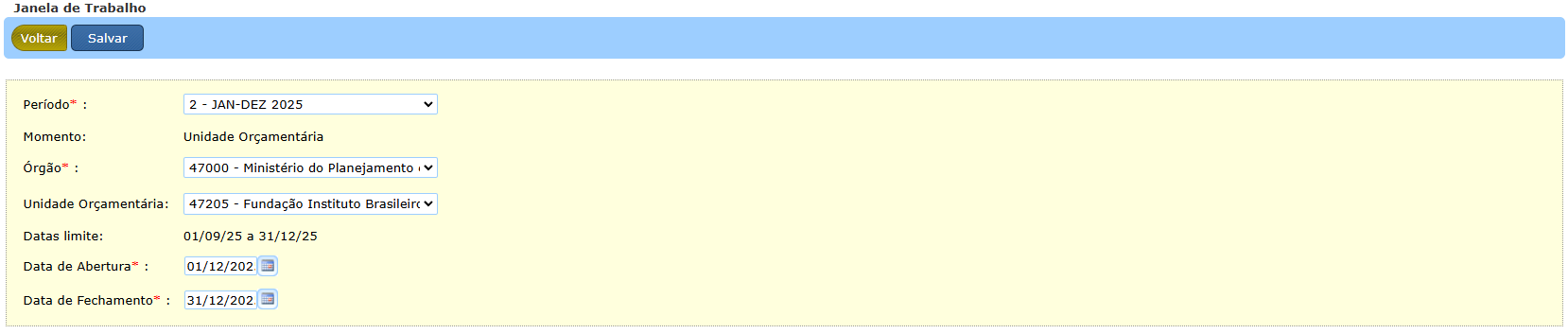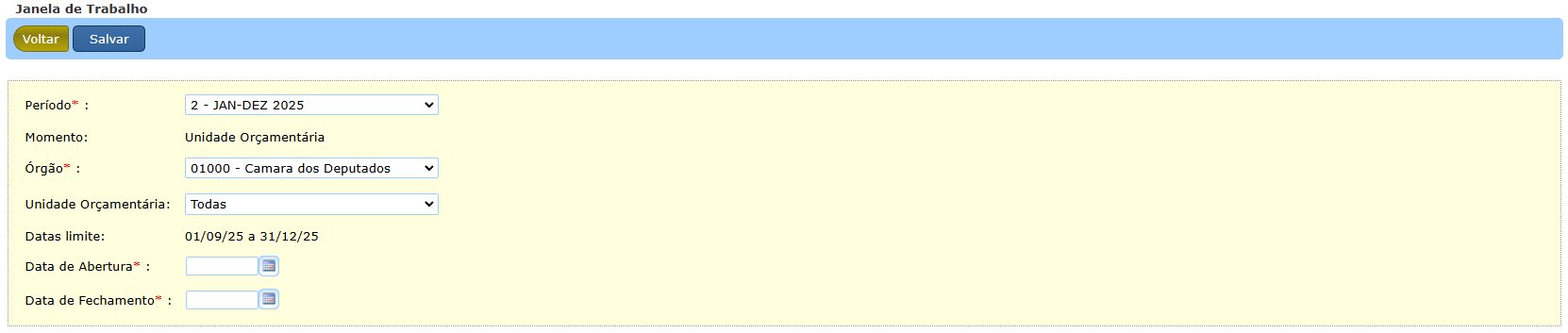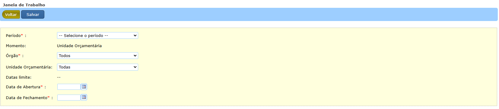 Ao selecionar o período e Órgão, o sistema informará as “datas limite”. As janelas para UOs (geral ou específicas) devem estar compreendidas nesse período. Na tela também poderá ser escolhida uma Unidade Orçamentária específica ou “Todas”. Nesse último caso, será criada uma Janela Geral para todas as UOs do Órgão.