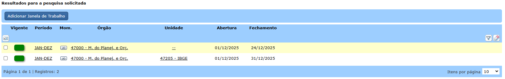 O resultado da pesquisa contém a informação da data de abertura e fechamento da janela de trabalho, caso esteja cadastrada: