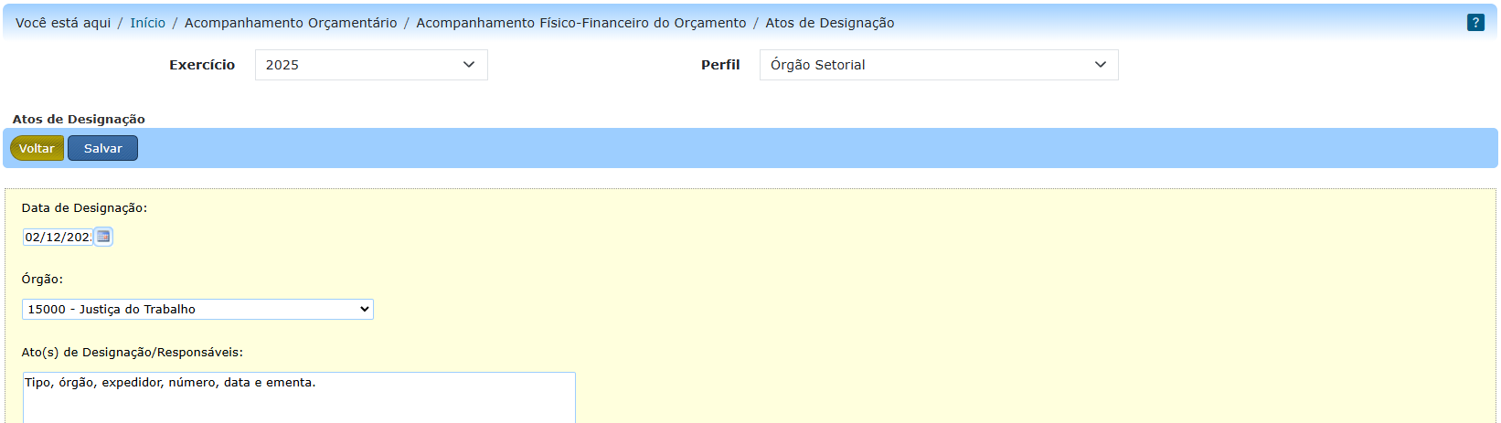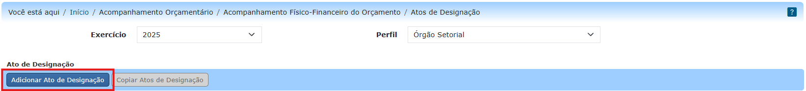 Apenas usuário com perfil Acompanhamento Orçamentário (OS) ou Órgão Setorial e com o papel Gestor do Acompanhamento Orçamentário podem adicionar atos de designação.