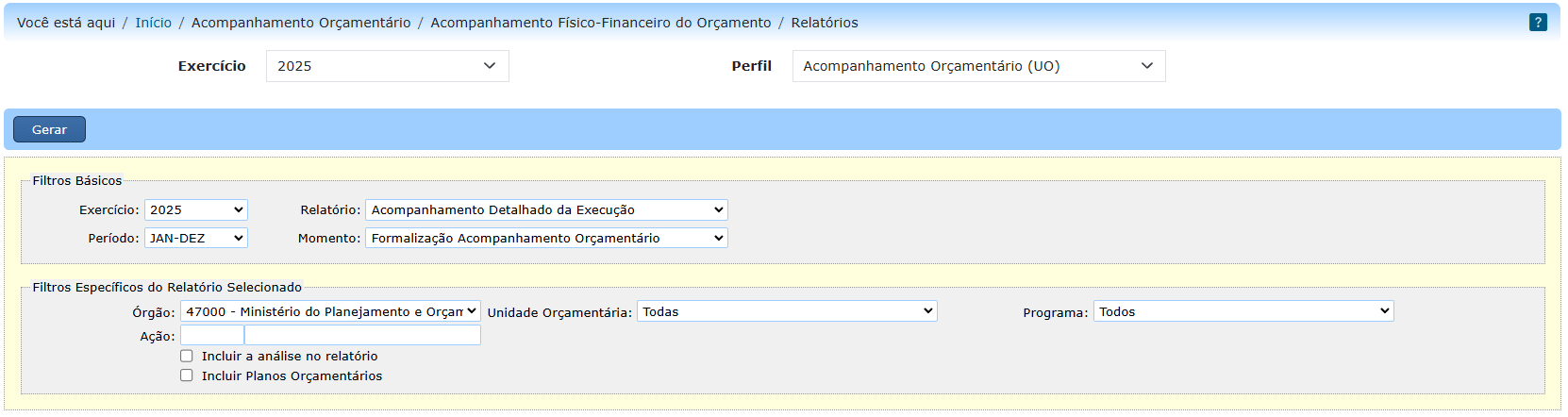 Os relatórios disponíveis em “Acompanhamento Orçamentário » Acompanhamento Físico-Financeiro do Orçamento » Relatórios” para os usuários setoriais são:
