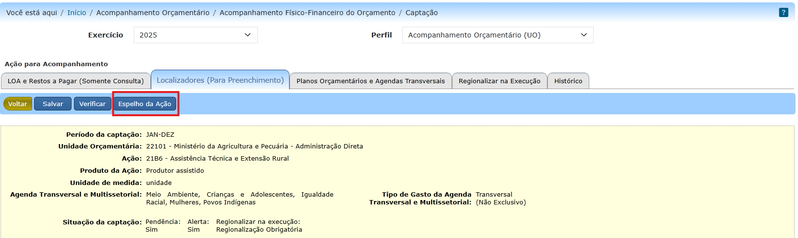 Em Acompanhamento Orçamentário » Acompanhamento Físico-Financeiro do Orçamento » Captação, após o usuário filtrar alguma programação específica, existe o relatório Espelho da Ação que fornece o detalhamento do preenchimento da programação.