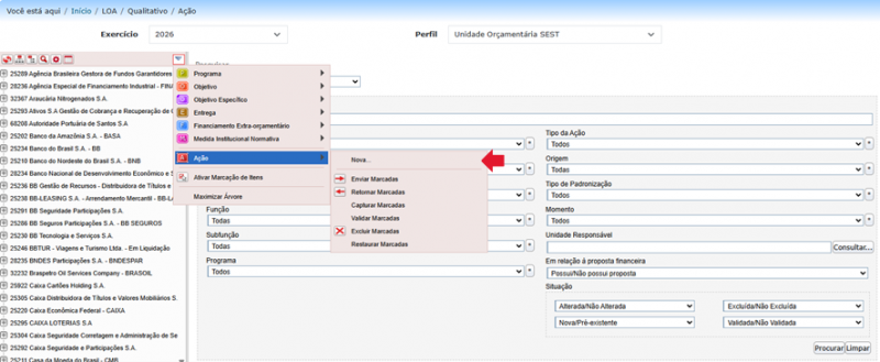 LOA → Qualitativo → Clica na seta da Árvore → Ação → Nova