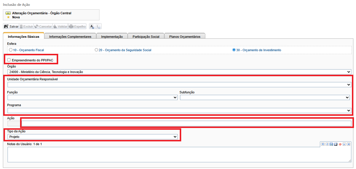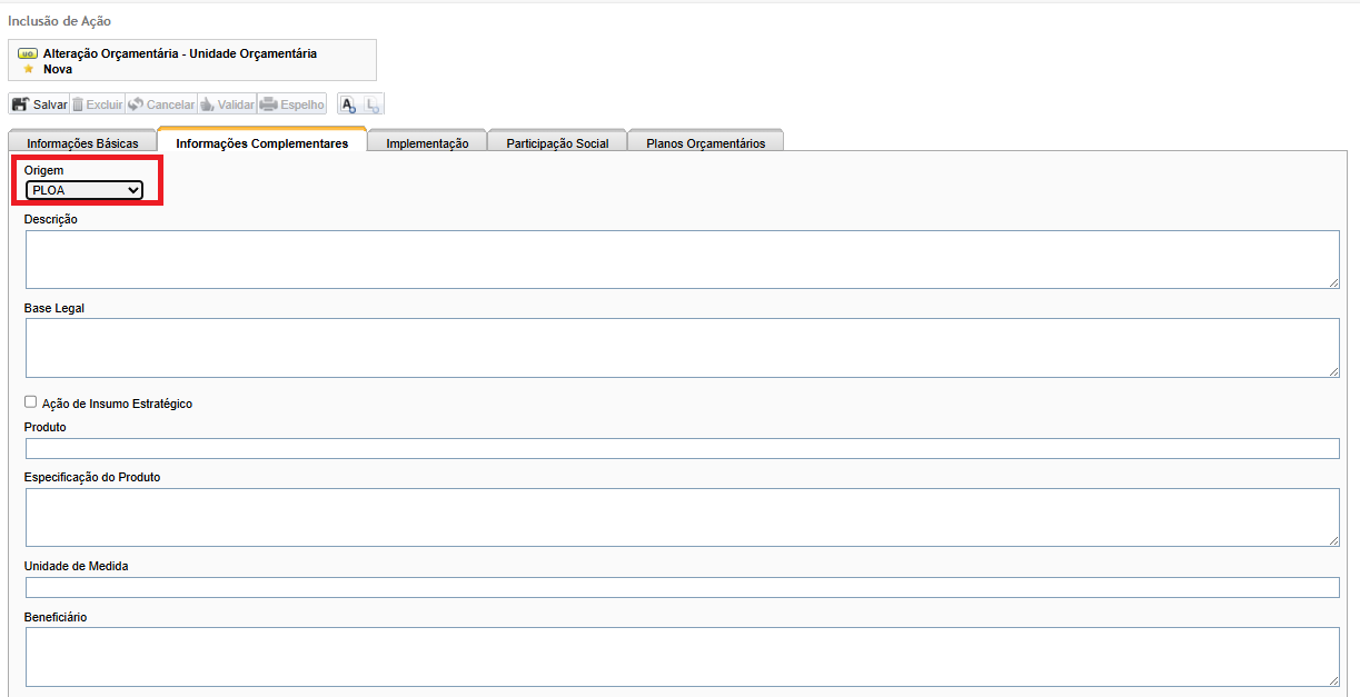 Atenção para o campo 'Origem da ação', que durante a elaboração do PLOA deve ser marcado com “PLOA”. Preencher os campos Descrição, Base Legal, Produto, Especificação do Produto e Unidade de Medida. O preenchimento de todos os campos é obrigatório para as ações do tipo projeto, já para as ações do tipo atividade os campos produto, especificação do produto, unidade de medida e beneficiário não são obrigatórios, contudo, o seu preenchimento confere maior transparência à política pública executada por meio da ação.