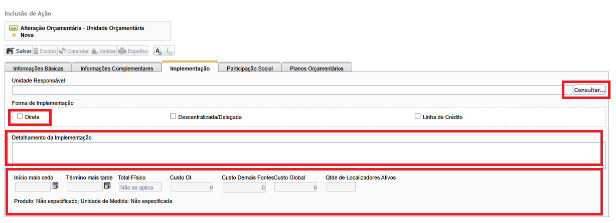 Indicar a Unidade Responsável, a Forma de Implementação (a qual é sempre direta para o Orçamento de Investimento) e o Detalhamento da Implementação. Para as ações do tipo projeto aparecerá os campos relativos ao Localizador do projeto, esses campos serão preenchidos automaticamente pelo SIOP após o preenchimento das informações do cadastro do Localizador.