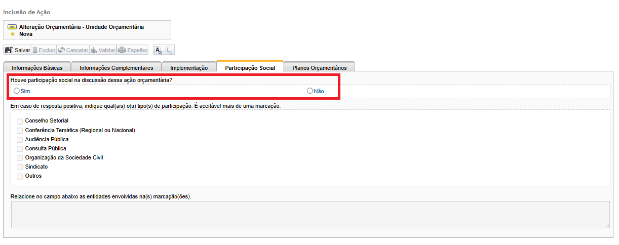 Indicar se houve participação social na discussão da ação e demais campos em caso de resposta afirmativa.