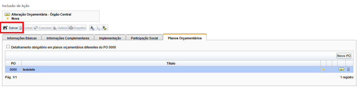 A aba Planos Orçamentários não é aplicável ao Orçamento de Investimento, portanto, não há necessidade de preenchimento. Após concluídas as etapas anteriores, deve-se Salvar a ação orçamentária e atribuir seu(s) Localizador(es), conforme demonstrado Localizador / Subtítulo.